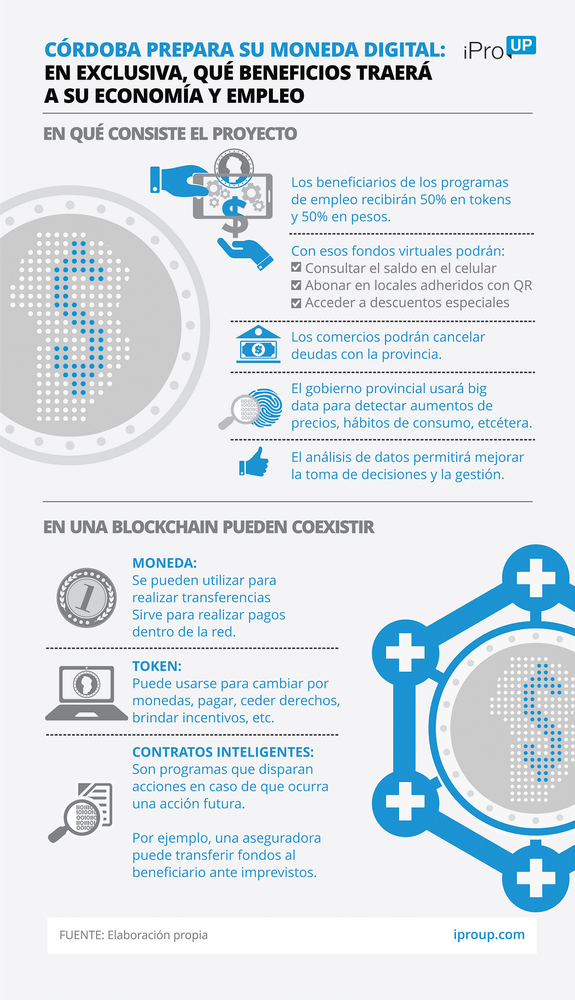 La iniciativa consiste en la creación de un “token”, un término usado por Bitcoin y otras divisas digitales para designar a un activo que representa a otro, virtual o real. En Córdoba, el valor de este token, representa efectivo. Se planea introducirlo a la circulación por medio de los planes de fomento de empleo.