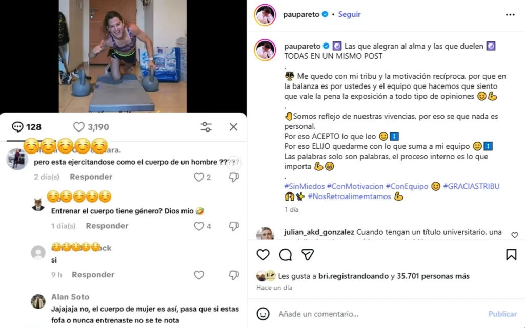 Entre los mensajes que decidió exponer se destacaron insultos relacionados con su musculatura, lo que volvió a poner en debate los estereotipos sobre el cuerpo femenino en el deporte de alto rendimiento. Sin mencionarlos de manera directa, Pareto remarcó la necesidad de no permitir que ese tipo de agresiones definan la identidad personal.
